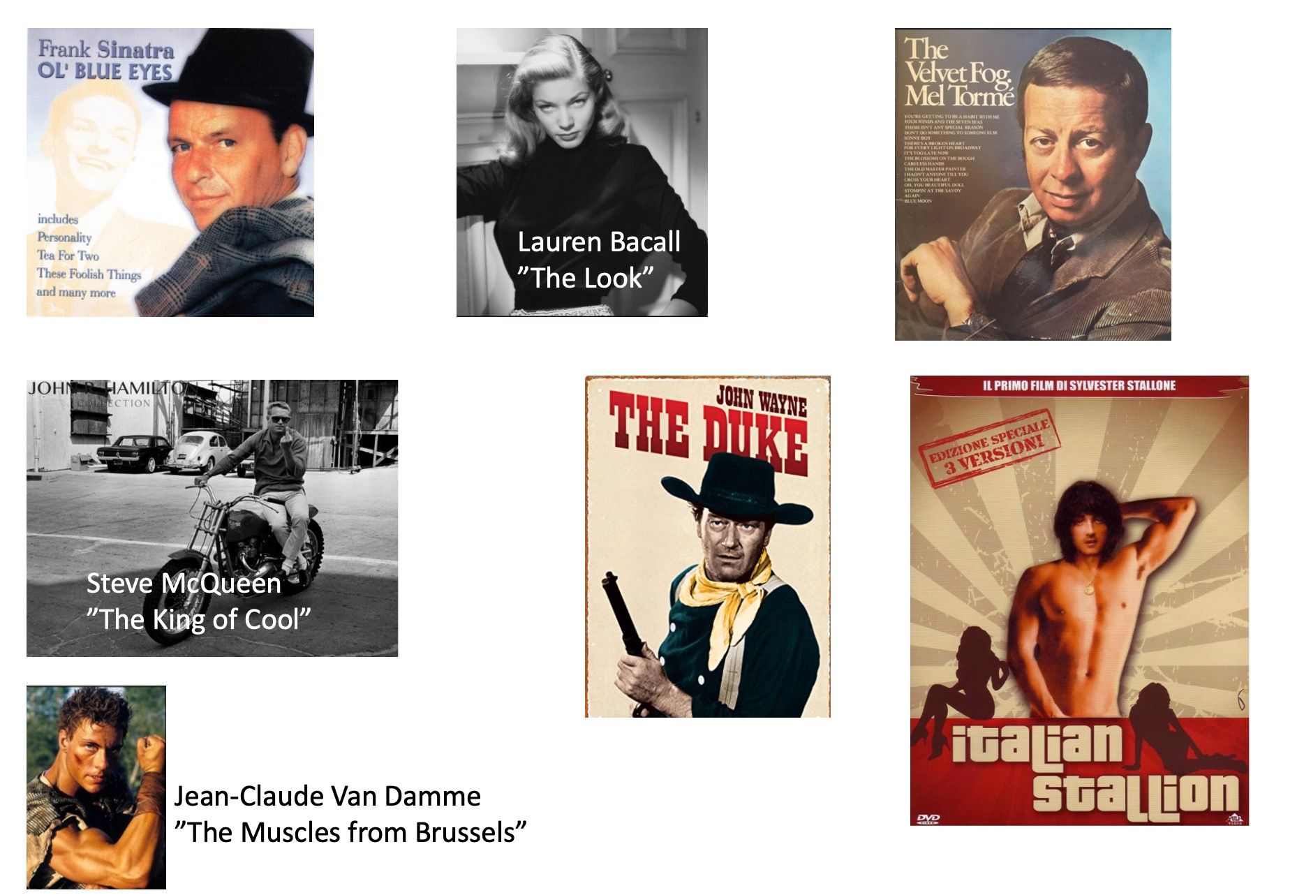 Es waren alles Übernamen von Schauspielern (also nicht Pseudonyme, John Wayne ist ja schon ein Pseudonym, sondern Nicknames, wie sie damals in der Presse und in Büchern genannt wurden und zT heute noch werden).
