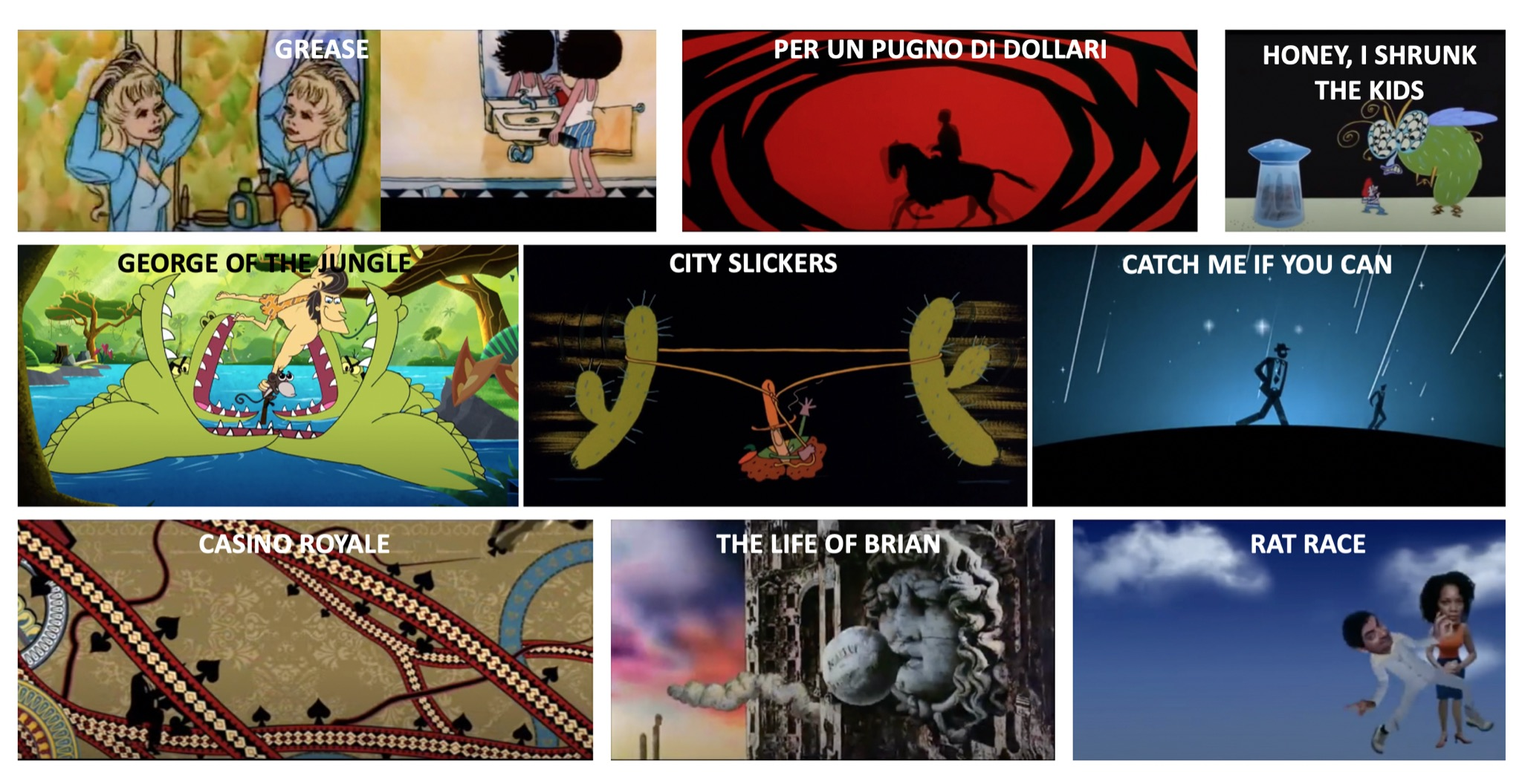 Es sind alles Ausschnitte aus animierten Vorspannen ('opening credits') für berühmte live-action Spielfilme, also für nicht-animierte Spielfilme. (Das berühmte Beispiel ist aus dem ersten The Pink Panther Film (1963), wo der Vorspann so gut ankam, dass eine eigenständige Trickfilmserie daraus wurde (was bei den anderen, so viel ich weiss, kaum der Fall ist. In einem Beispiel ist es umgekehrt: Da gab's die Trickfilmserie schon, bevor der Spielfilm mit Fleisch-und-Blut Schauspielern gedreht wurde.)